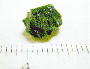 Additional Testing: The observation by Milosz Kuss (who found the glassy rock) that he saw a long-term phosphorescence or fluorescence continued to intrigue us. We requested an additional sample, specifically from the lighter-green "veins" reported to be visible in the stone and, in December 2003, we received an additional small (< 2mm diam.) light green glassy shard for analysis.