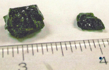 Physical Form: As can be seen in the above photos the larger sample (before being split in two) was approximately 1.2 cm long, the smaller slightly less than 1 cm. Both are seen to be of similar color, a very dark green-black. We also observe that small ( 2mm) bubbles and voids are present in both, consistent with the immediately apparent likelihood that these samples are essentially glass.