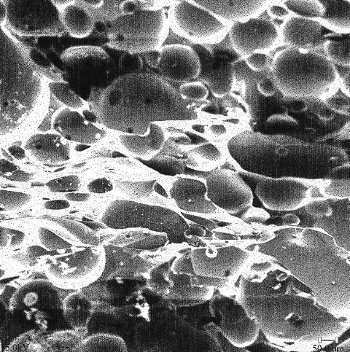 EDS revealed the composition of this new sample to be quite similar to the samples already examined. However, SEM photography revealed that this shard was quite "foamy" in appearance, infused with tiny air-bubbles and voids, typical for ceramics. These air bubbles are thought to account for the overall much lighter-green coloration in some areas of the retrieved stone.