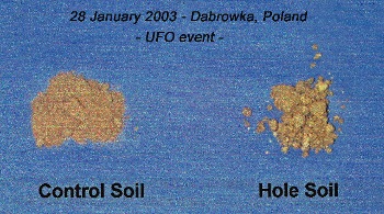 Since the UFO-related "vitrified stone" Golabki event occurred in late summer of 1998 and the UFO-related unexplained hole was found in the nearby village of Dabrowka in January of 2003, it is obvious that the soil from the Dabrowka hole could not have been the material which had been vitrified to create the Golabki "stone." However, once the Nautilus Foundation's interest in these unusual phenomena became known they were notified of many very strange, often quite deep, inexplicable holes which had been both previously (as well as currently) discovered in various parts of Poland.