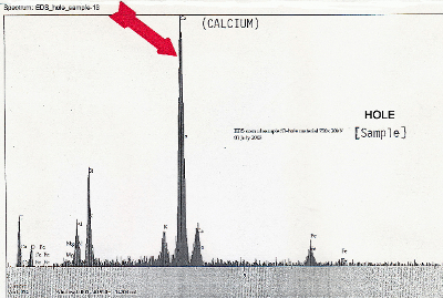 The FT-IR and EDS analyses both show the "control" sample to contain typical elements found in quartz, including major amounts of silicon, aluminum and oxygen with small amounts of iron, potassium and magnesium. Conspicuously absent are kaolinite and calcium carbonate, which are present in the sample from inside the hole.