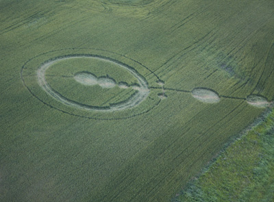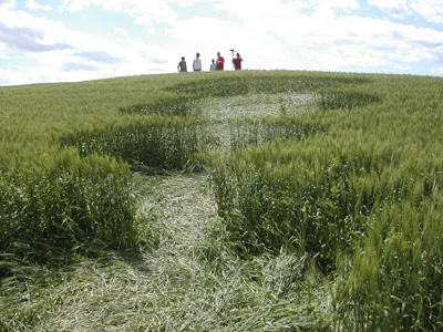 Two other findings the fact that the circles were actually ellipses in which the long diameter went across the hillside and the missing seed-heads on standing plants confuse the issue further. And the precision of the overall design, particularly in such a large formation on quite sloping land, also needs to be taken into consideration, particularly if we are thinking that local (and thus inexperienced) individuals made this particular crop circle.