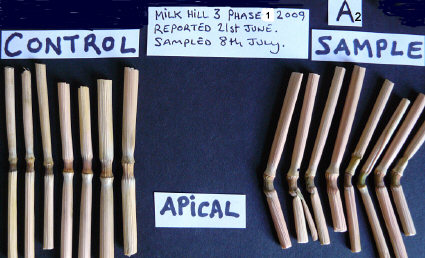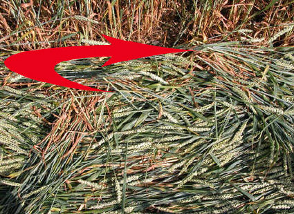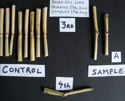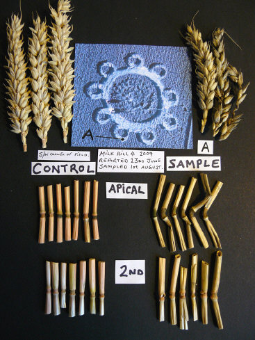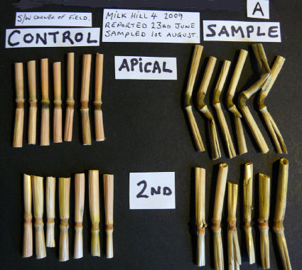 The plant changes found in Sample B (taken from the small "grapeshot" on the left, nearest the tramline in photo above) revealed a clear reduction in seed-head development -- which was not seen in Samples A and C, taken from larger downed-crop areas. All three sample sets did contain expulsion cavities in all of the 2nd nodes beneath the seed-heads, as well as in some of the 3rd nodes.
