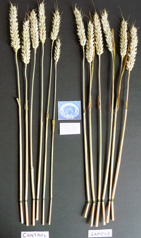 The few samples we have from the "Mayan Mask" were obtained 25 days after it appeared and, in comparison to the controls, do not exhibit any obvious signs of developmental inhibition of the seed-heads.
