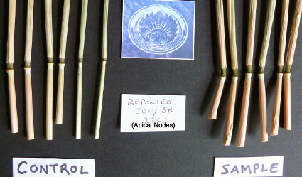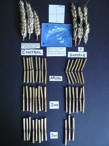 So, in this case, where pronounced apical node elongation does appear to be present (but in both the samples and the controls) -- but with no expulsion cavities in the 2nd nodes and only a few in the 3rd nodes -- and with what also appears to be normal seed-head development in all of our samples, we're again confronted with the need for much more extensive sampling and statistical analysis, as well as germination trials and other laboratory analysis.