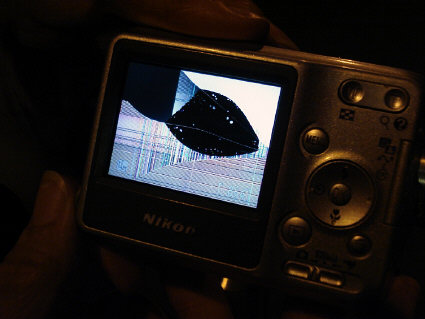 When the chip was taken out of this camera and placed in another so the photos previously taken could be viewed, this image on the LED screen was not on the camera's chip -- so it is not an actual photograph, but some sort of artifact on/in the LED screen itself. It is possible that Dean may have damaged the camera by lying on it, thus causing this odd LED display, but photos taken subsequently with the camera appear normal, with no trace of this LED screen image on the new photos -- although the camera's shutter mechanism now "rapidly closes and opens after a photo is taken until the camera is given a whack to make it quiet down." And the peculiar LED screen image re-appears after new photos are taken.