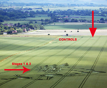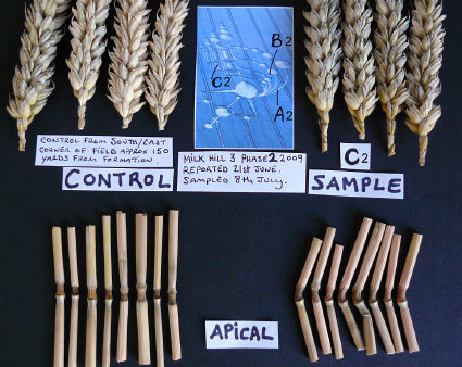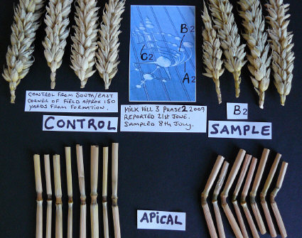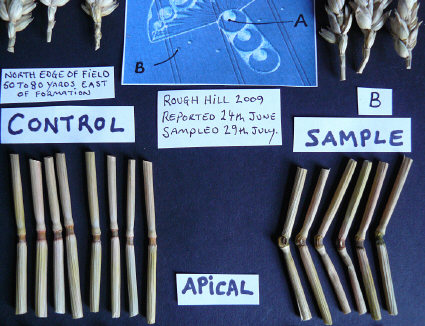 Since we know from the intensive sampling and lab analysis carried out by BLT in the 1990s that a "spillover" effect into standing crop beyond the flattened perimeters of crop circles can -- and does -- occur in some events, and because all of the "controls" for this 2009 3-phase formation at Milk Hill were taken from an area that might well have been affected by other plasma discharges in several other events nearby, and also because we have never seen "control" plants previously in which the apical nodes looked as affected as those in these "controls," we have reason to ask seriously if we actually have any real "controls" for the 400m-long, 3-phase formation.