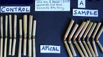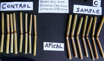 It is my personal opinion, based on 10 years of scientific evaluation of crop circle plants and my continuing expeditions into crop circle fields in multiple countries and my examination of plants in those situations, that significant apical node elongation is present in our samples from this extraordinary 3-phase Milk Hill event. And I also think that our "controls" taken from that SE corner of the Milk Hill field had also been affected, thus rendering them ineffectual as "controls." If we had obtained controls from multiple different areas of that field, I think we would have been able to clearly prove this.