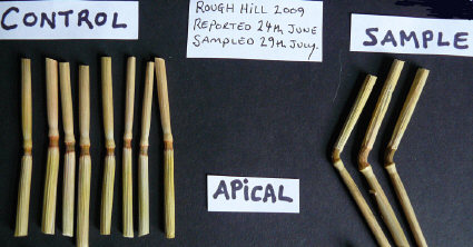 The problem here, of course, is how to interpret these results. Apical node elongation ("stretching" or "lengthening" of the first node beneath the seed-head) is the best-documented and most reliable visible plant change indicating authenticity established by the BLT work during the 1990s. The presence of expulsion cavities found in the lower stem nodes is also a strong indicator, but we know that these do not always occur in genuine formations (circles in which in-depth sampling and subsequent lab analysis in the past documented enough other factors to indicate authenticity) -- and based on our earlier work we know that this is particularly true of British formations.