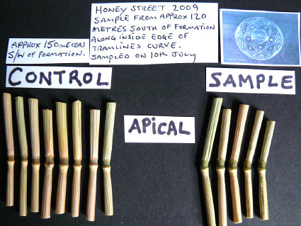 In the Rough Hill formation (and several others we examined in 2009) we did find some expulsion cavities (and a few elongated apical nodes also) in plants running along tramlines that went through the actual formations themselves, but at a considerable distance away from the crop circles.