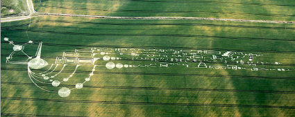One of the 2009 formations which attracted a lot of attention was this one, which appeared in the field across the A4 from Silbury Hill. A Los Angeles film crew happened to be conducting a "night watch" on top of Silbury Hill the night this formation occurred and, although they were awake and watching all night, they neither saw nor heard anything unusual during the approximately 5 hrs. of darkness before one of their group discovered the circle at first-light, around 4:30am.