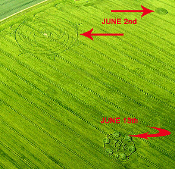 Phase #1 (top) of small crop circle found on June 21st and with "addition" (bottom)