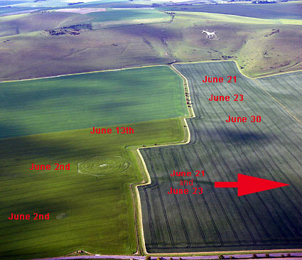 Finally, and I think most importantly, we must consider the (in retrospect) unfortunate fact that our fieldworker took all of his "control" plants for this huge Milk Hill 3-phase formation from the SE corner of that field. It turns out that there were several small, odd, flattened areas in this section of the field, as well as the smaller 2-phase circle ("Milk Hill #4," arrow) whose first phase was found on the same date as phase #1 of the larger event and whose second phase appeared on the same date as phase #2 of the larger formation up closer to the white horse.
