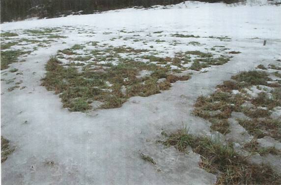 Fig. 3: Close-up of one ice ring (approx. 30 cm wide), photographed in February, 2004; note color alteration in grasses where ice-ring has melted. Photo: Thor Riseth.