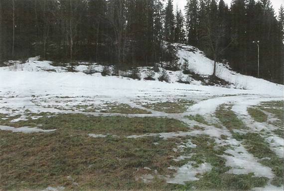 Fig. 4: Anders Mona and associate taking soil samples in May, 2004 for chemical analyses; some of the rings and pathways of the ice-pictogram were still visible (due at this time in May to the absence of grasses in these areas), making sampling relatively easy.