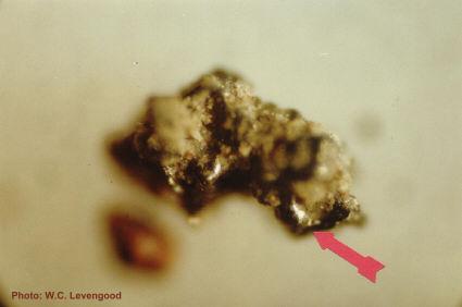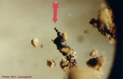 | Photomicrograph (100 X) of soil from a crop circle showing traces of melted magnetic material adhering to soil grains. |