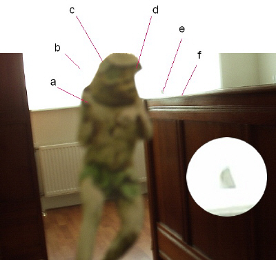 Our photo analyst also points out that the lighting of this mudman figure is inconsistent with the lighting in the bedroom (i.e., the mudman is lighted more as he is in the RD photo, rather than he would have been had he been physically present in the room), another factor regarding this particular photo which he could only attribute to someone having "tampered" with the photo, most likely using a computer.