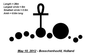 This formation, which includes what looks like an Egyptian "ankh," appeared on May 10, 2012 at about 1:00 am. Prior to its appearance Robbert had felt a "feminine" energy and saw in his "mind's eye" light emanating from many of the circles as well as a feminine figure directly over the "ankh" symbol with a beautiful glowing white light around her. He also saw a "big white cat with brilliant green eyes" next to the woman's figure, something which seems a bit odd, given the apparent tenor of the overall "vision."