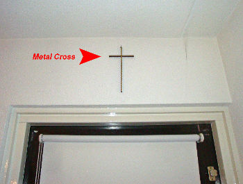 Stan, who was on his computer at the time, didn't see the first flash of light but did hear the rasping noise made by the metal cross rubbing against the wall and, hearing the noise, looked up and then also saw the cross swinging back and forth all by itself.