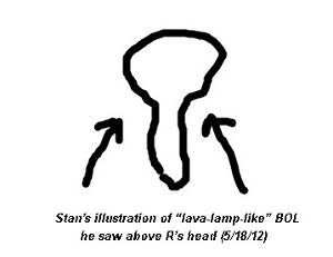 As Robbert stood up Stan saw what he described as a "BIG BIG BIG ball of light" fly out of the cross and shoot across the living room directly into Robbert's forehead. Stan says "pieces" of the light-ball "sprayed up above Robbert's head" -- the whole event so startling that Stan had to "catch his breath." Stan's drawing (below) shows how the "pieces" of the light-ball rose up above Robbert's head, much like the bubbles rise up inside a lava-lamp.
