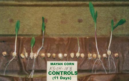 Also familiar to individuals who are aware of the scientific research conducted on crop circle plants is the fact that seedlings grown from seeds taken from plants inside the formations regularly exhibit abnormal growth patterns, relative to control seedlings: [www.bltresearch.com/plantab.php, item #5 (a)(b)(c)(d)]. We know that when crop circles occur early in the growth season the seeds from these plants show significantly retarded growth habit. Of perhaps greater interest is the fact that seedlings grown from seeds obtained from late-season crop circles show not only a marked increase in growth-rate, these plants produce greater yield than the controls, in conjunction with increased resistance to "growth stressors" (lack of sunlight and/or water). Following the discovery of these germination and growth changes in crop circle plant seeds, research carried out by W.C. Levengood and John Burke eventually resulted in the development of a non-chemical, non-genetic technology which stimulates normal seeds to produce beneficial antioxidants. This MIR StressGuard process improves the seedlings' ability to withstand free radicals, resulting in the same increased growth rate and yield, and increased resistance to plant stressors, with no harmful environmental consequences.