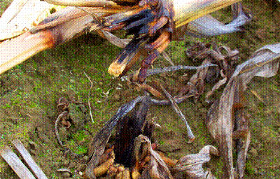 We did not receive the "cut" and blackened plant stem photographed at the same location and, so, cannot determine with 100% certainty whether it's darkened end is due to burning or Ustilago. But given that the seedhead we did receive is now proven to have been burned, and the fact that the "cut" plant stem was not only observed in the same area but on the first day of the formation's existence, it's blackening is most likely due to burning also. [Blackening caused by Ustilago would take many days before being visible.]