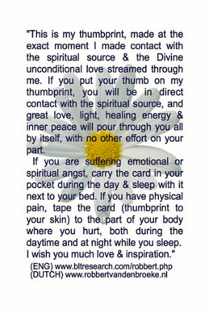 Since moving to his own home more than a year ago Robbert has not been able to see his many clients who had been coming to him regularly for "readings" or "healings" when he lived at his parents' home. One night in mid-2012 he experienced a vision during which he got the message that he should "concentrate" himself on the unconditional loving energy which helps him work with his clients and--while in direct contact and with this energy streaming through him -- make an inked thumbprint which could then be copied onto a small card for all the people Robbert is unable to see personally.